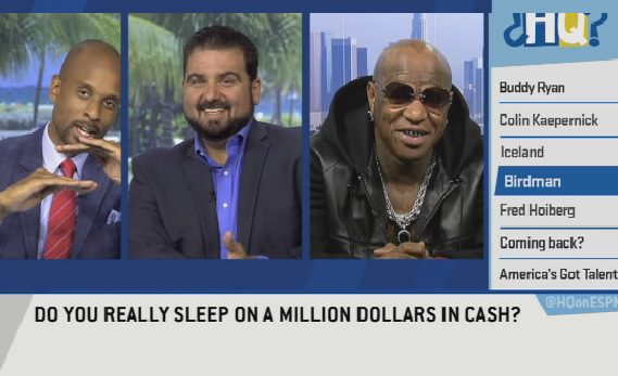 Dan Le Batard, Big Papi and Bomani Jones invited Birdman to the show for one hilarious — and at times awkward — chat with the one and only co-founder Cash Money Records. From his first $30 million dollar contract with Universal to the rumors that he sleeps on a million cash, the rap-loving-hosts fired away.