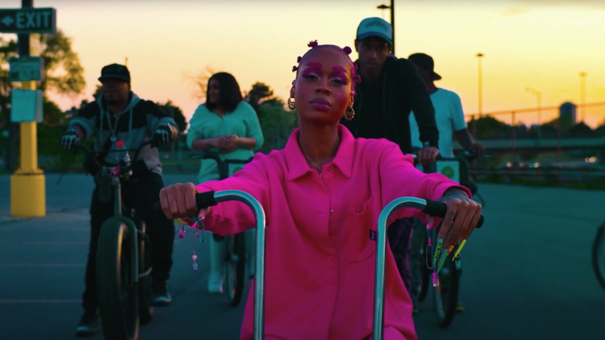 In the visual, Ebhoni flaunts a new look that showcases her badass side. With long, colorful nails and blown-out vintage film fuzz, Ebhoni looks like an icon from pop’s past transported to the modern day. Armed with a fun-loving crew, a few low-riding bicycles, a neon pink chore jacket, and matching eyeshadow, Ebhoni radiates a cool that feels entirely her own.