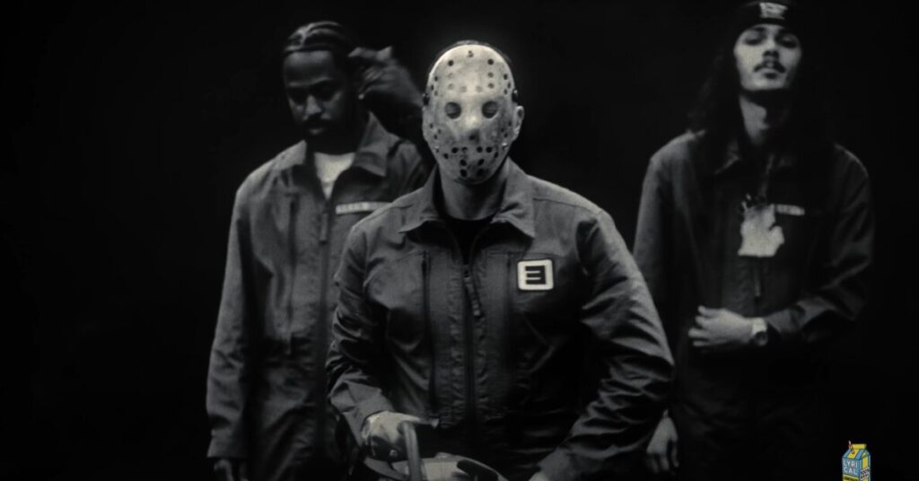 In a Jason Vorhees mask and wielding a chainsaw, Eminem questions the legitimacy of top rapper lists, rapping,