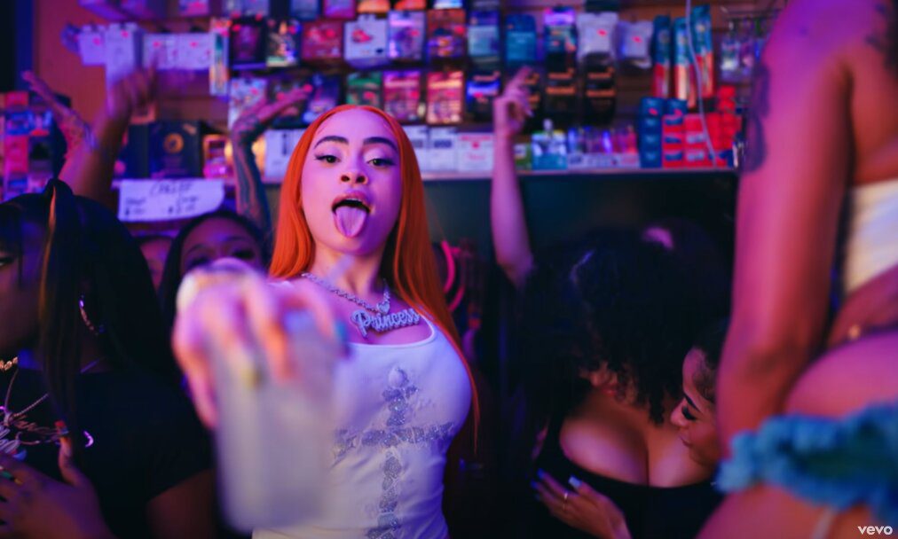 She raps with a fistful of money, “Taking her spot / If you ain’t cooking, then get off the pot / My name Ice, but I always stay hot,” while her girlfriends twerk and fans gather.
