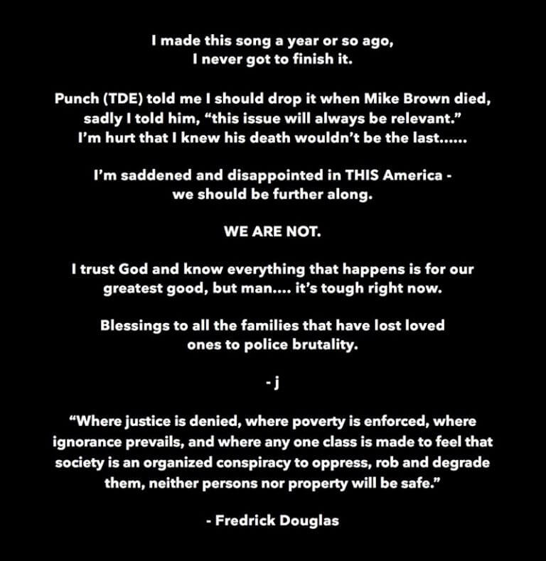 “Punch [President of Top Dawg Entertainment] told me I should drop it when Mike Brown died. Sadly I told him ‘this issue will always be relevant.’,” JAY Z says in the opening of a statement he dropped with the song. The track, recorded over a year ago, comes hours after Jay’s wife Beyoncé issued a statement on her website demanding justice and speaking out against the endless killings of black people by police officers in America.