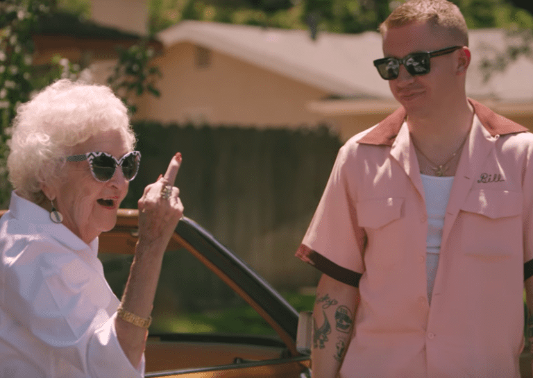 The “Thrift Shop” rapper now returns with a fun-filled, personal music video for “Glorious.” Known for his touching visuals, Macklemore heads to Modesto, California to celebrate his grandmother’s (Helen Schott) 100 birthday. Directed by Jason Koenig, the clip finds the pair reliving Schott’s younger years, driving around and egging houses, buying sneakers, doing karaoke, getting tattoos, and booking a stripper before ending their day by the lake.