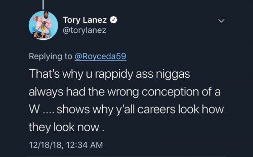 “No,” said the Detroit MC in response to the tweet. Tory saw the comment and fired back in a since-deleted post: “That’s why u rappidy ass ni**as always had the wrong conception of a W … shows why y’all careers look how they look now.”