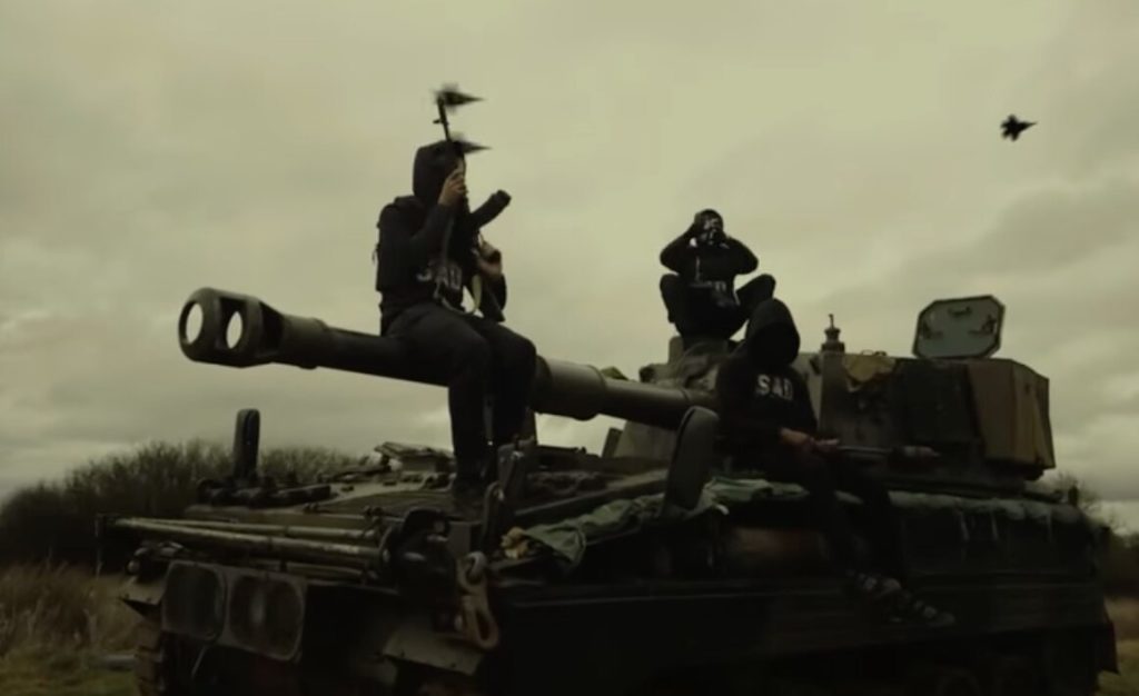 The images feature PR SAD, Dopesmoke, and R6, all pumped up on a battlefield with tanks, echoing the song’s militaristic tone.